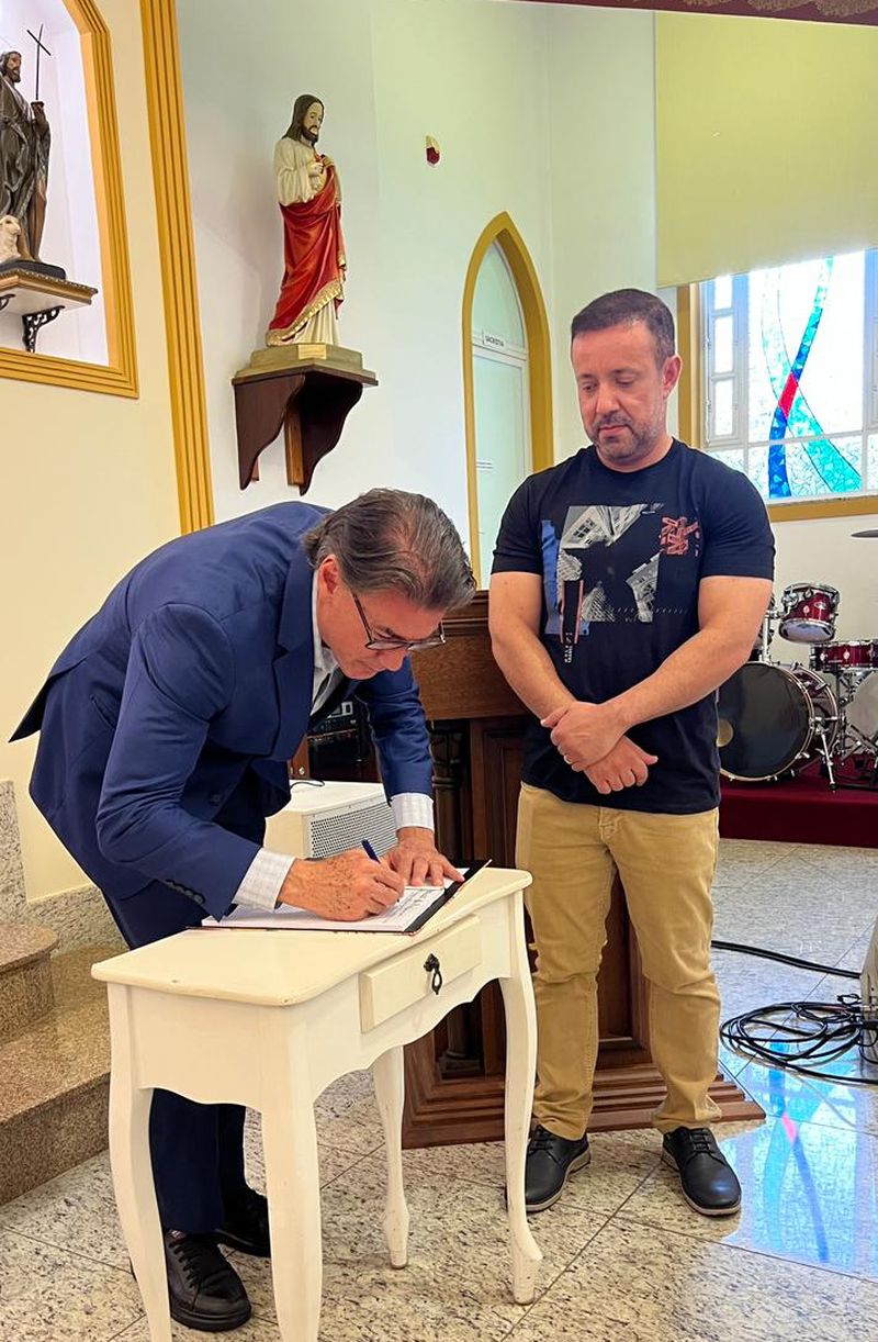 O secretário estadual de Turismo do Paraná, Leonaldo Paranhos, inaugurou o livro de registros de visitas da Matriz São João Batista, de Foz do Iguaçu, nesta segunda-feira, 8, a convite do pároco padre Willian Paiva. Com o livro, a igreja terá um banco de dados de visitação de turistas e fiéis de todas as partes do mundo.